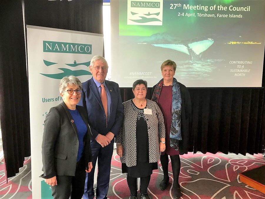 á myndini eru frá vinstru: Geneviève Desportes, NAMMCO aðalskrivari, Poul Michelsen, landsstýrismaður, Amalie Jessen (Grønland), forkvinna í NAMMCO ráðnum, Kate Sanderson (sendileiðari fyri Føroyar í NAMMCO ráðnum).